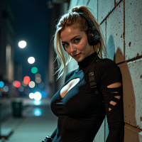 black leggings or tights, which are likely made of spandex or polyester for comfort and flexibility. The background of the image is dark, suggesting that it was taken at night or in an area with limited lighting. The wall behind the woman appears to be made of off-white bricks, adding a touch of urban grittiness to the scene. Overall, the image conveys a sense of edginess and coolness, as if the woman is ready to take on whatever challenges come her way.