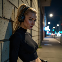 crop top that exposes her midriff * Black leggings that cover her legs * Headphones covering her ears The background features a brick wall and a dimly lit street, suggesting the scene takes place at night. The overall atmosphere appears relaxed, with the woman leaning against the wall, possibly taking a break or enjoying some music. The image exudes a sense of calmness and serenity, capturing a moment of solitude in