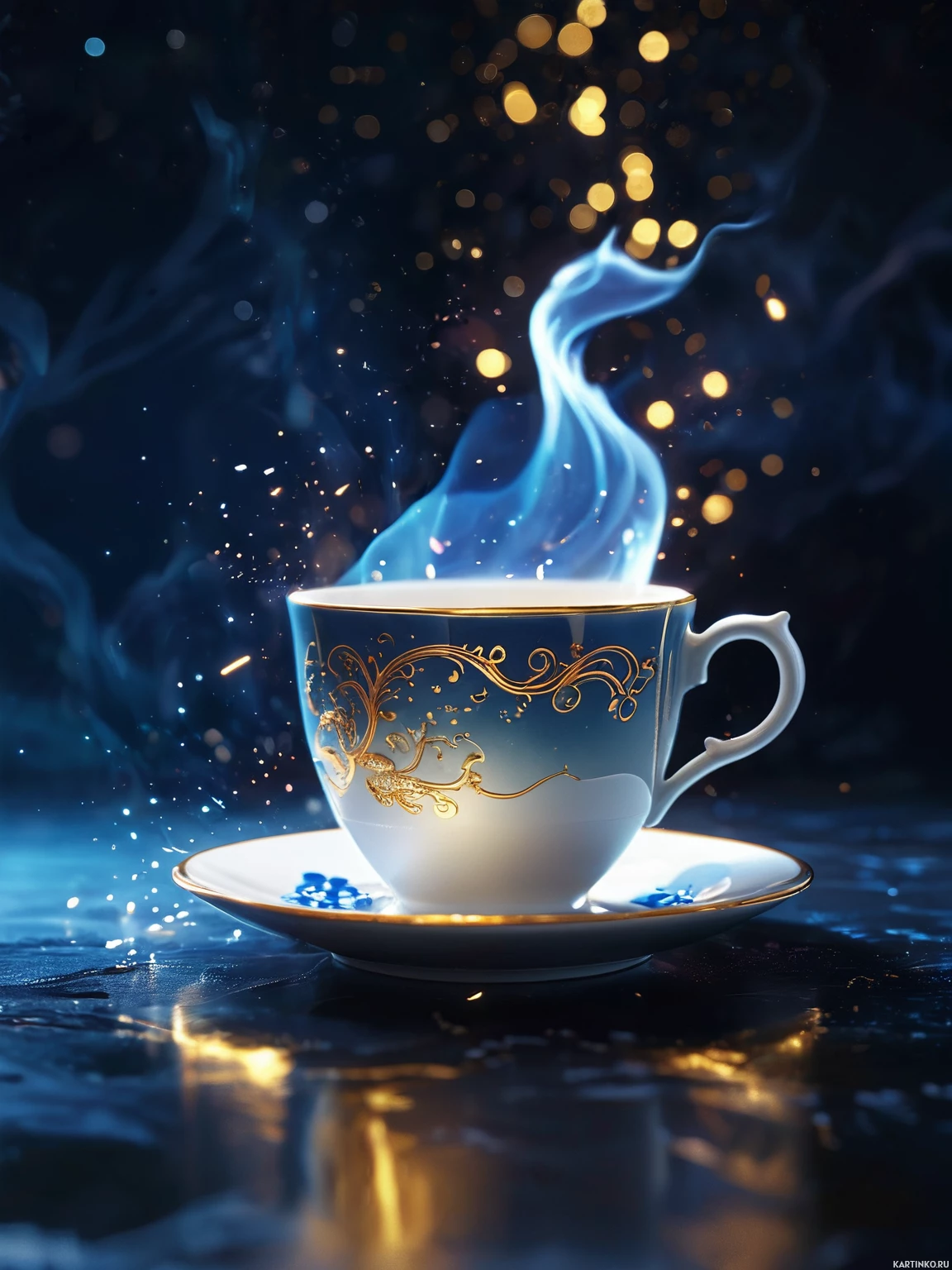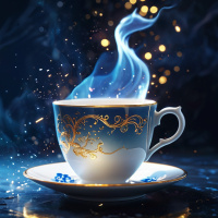 a night scene or perhaps a magical setting. The tea is presented in a decorative teacup, and there are sparkling,
