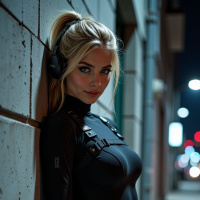 a young woman with blonde hair, dressed in a black outfit that includes a long-sleeved top and leggings. She is wearing headphones around her neck and has