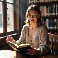a young woman sitting at a wooden table, engrossed in reading a book. She has shoulder-length
