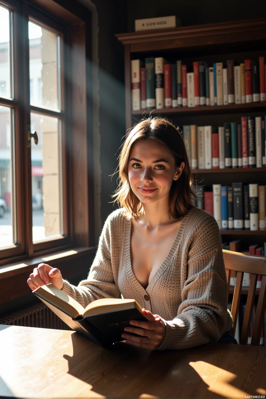 brown hair and is dressed in a beige cardigan over a white top. The woman's gaze is directed towards the camera as she holds the book open with both hands. In the background, a large window on the left side of the image allows