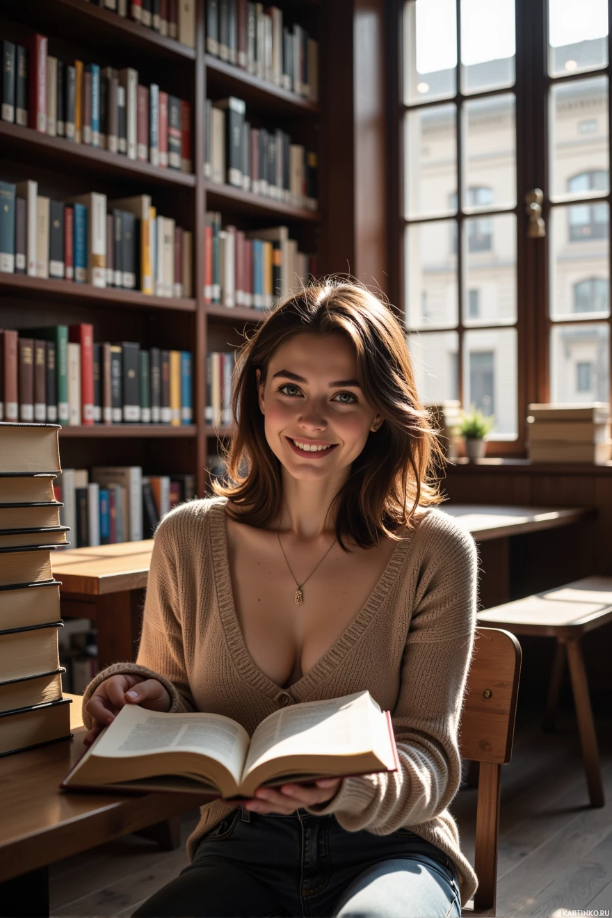 brown hair and is wearing a beige cardigan over a white top. + Her outfit is casual yet stylish, suggesting that she may be a student or someone who enjoys reading for pleasure. * In the background, there are several bookshelves filled with books of