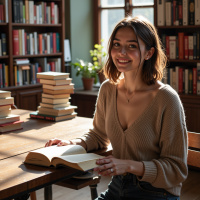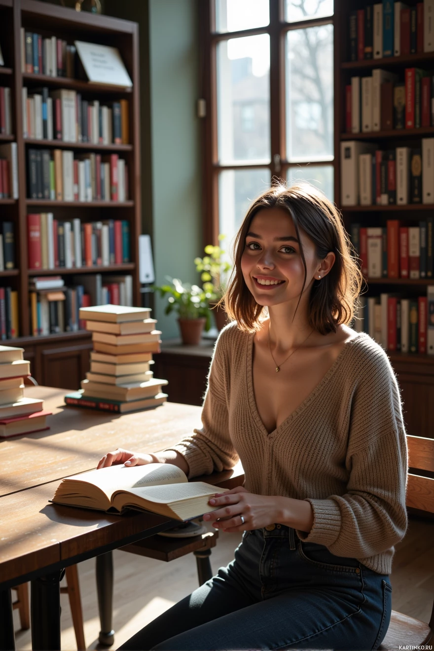a young woman sitting at a table in a library, surrounded by books and smiling. She has shoulder-length