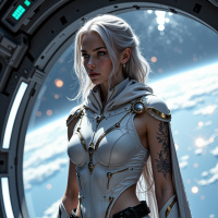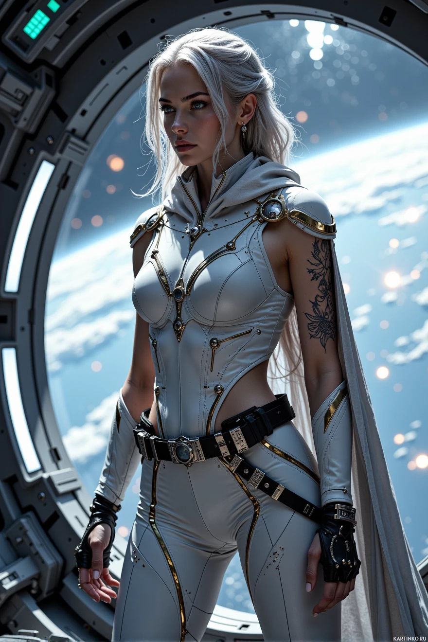 white hair standing in front of a large, circular window that offers a view of space. She is dressed in a futuristic outfit, consisting of