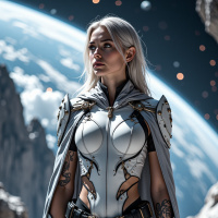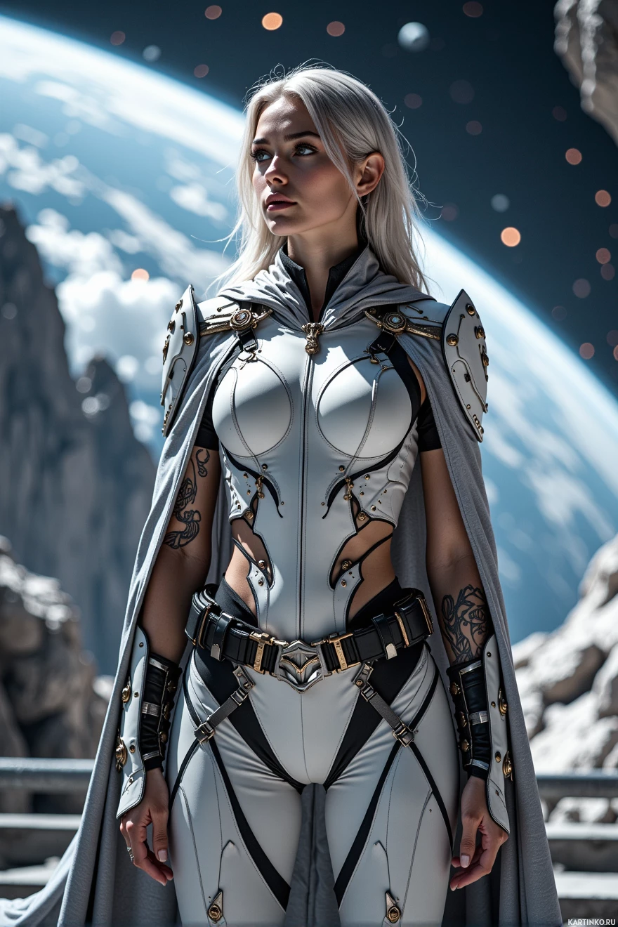 tech materials and ornate, almost medieval-inspired designs. The bodysuit is made of a shimmering silver material that catches the light and seems to ripple like water, while the cape flowing behind her is a deep blue-gray hue with intricate patterns embroidered along its edges. A delicate circlet adorns her forehead, set with tiny jewels that sparkle like stars. As she stands there, poised on the edge of space itself, it becomes clear that this woman is no ordinary being - she is a guardian or warrior from some distant world, tasked with protecting the cosmos from threats both internal and external. Her very presence seems to radiate an aura of power and authority, as if she has been chosen by fate itself to wield the forces of creation and destruction. In this image, we see not just a woman but a symbol of hope and resilience in the face of overwhelming odds; a reminder that even in the darkest depths of space, there are those who will stand strong against all comers.