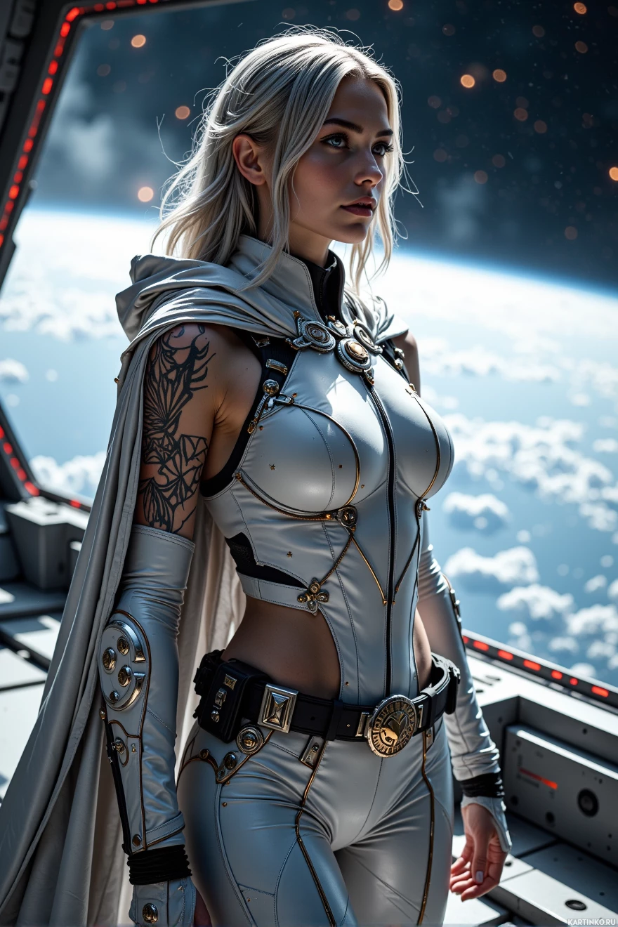 a science fiction setting. She is dressed in a silver jumpsuit adorned with intricate details and has