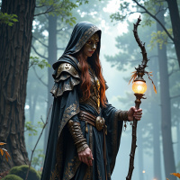 a forest setting, grasping a staff adorned with a glowing orb and surrounded by lush greenery. The overall atmosphere of the image is one of mysticism and fantasy, evoking the sense of a sorceress or witch navigating