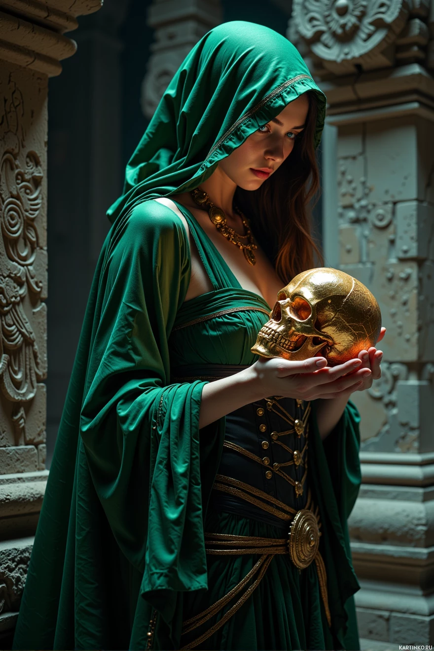 hair cascades down her back, partially obscured by the hood. In her right hand, she cradles a striking golden skull, its polished surface reflecting light and casting a subtle glow on the surrounding area. The woman's gaze is fixed intently upon the skull, her expression one of deep contemplation or reverence. The background of the image appears to be an ornate stone structure, with intricate carvings and details that suggest a sense of age and history. The overall atmosphere of the scene is one of mystique and mystery, as if the woman has stumbled upon some ancient relic or secret hidden within these walls.