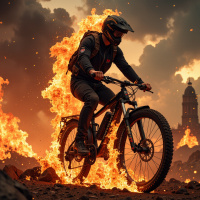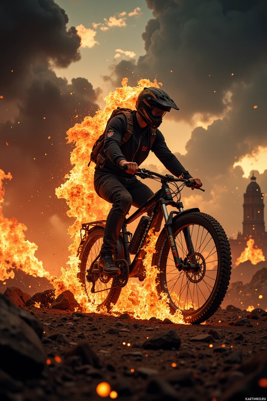 communication devices. In the background, there are large flames engulfing rocks and other objects, creating a dramatic and intense atmosphere. The sky above is filled with dark clouds, adding to the sense of danger and urgency. Overall, the image conveys a sense of adventure, risk-taking, and determination as the man navigates through this challenging environment on his trusty bicycle.