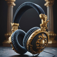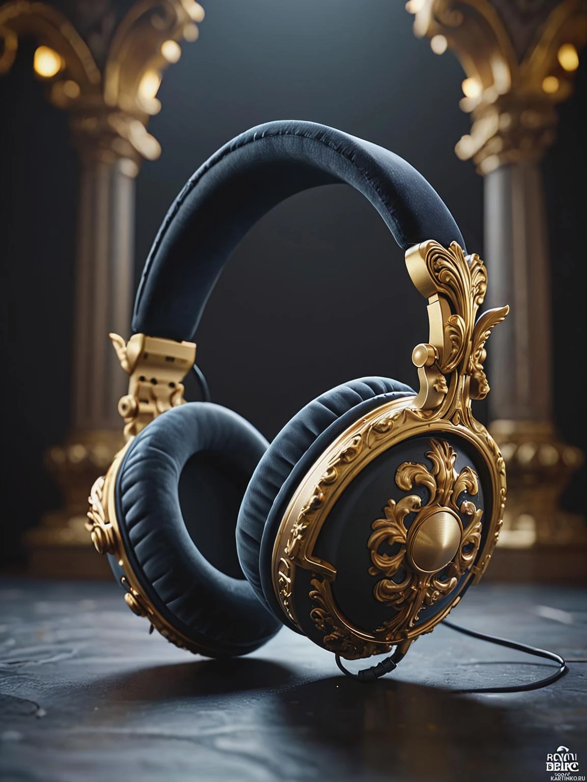 the reflective surfaces of the metallic parts and gives the scene a dignified ambiance. There are no visible people or brand logos on the headphones or in the background. The focus is solely on the headphones themselves, emphasizing their elegance and possibly their status as a high-end product.