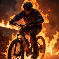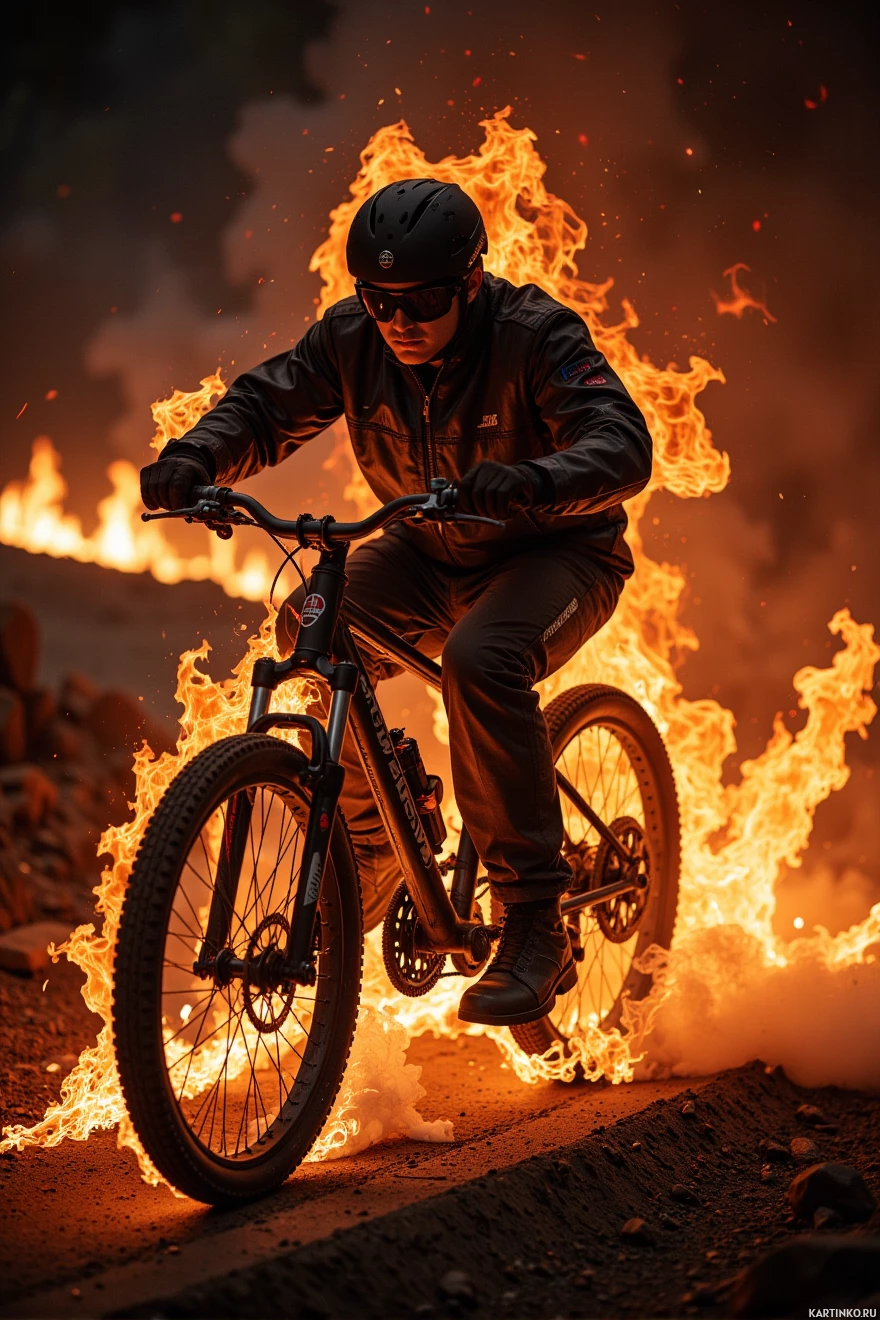 rough terrain and able to withstand the intense heat generated by the fire. As the man rides through the flames, he seems to be navigating the trail with ease, his focus fixed on the path ahead. His determination and skill are evident in the way he handles the bike, despite