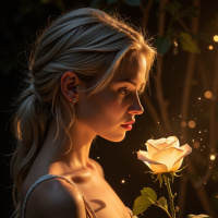 a young woman with long blonde hair, wearing a white lace dress and holding a rose in her right hand. The woman is turned to the right, gazing at the rose as it glows softly. * **Woman** * Age: