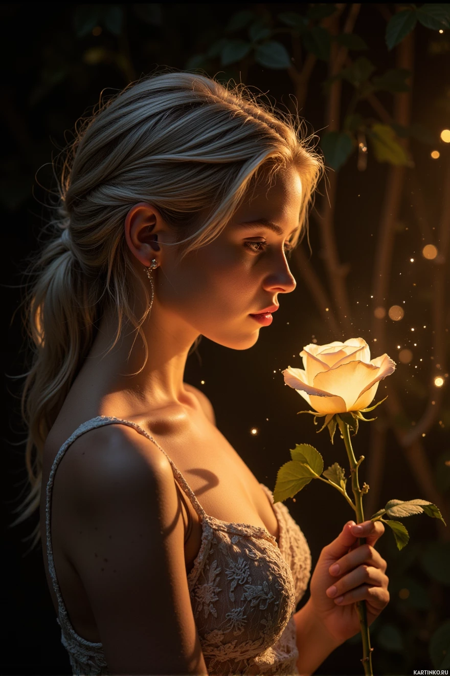 Young adult * Hair color: Blonde * Hair length: Long * Clothing: White lace dress with thin straps * Accessories: No visible accessories * **Rose** * Color: Softly glowing white * Size: Medium to large * Leaves: Green, attached to the stem * Stem: Thin, green, and slightly curved * **Background** * Color: Dark brown or black * Features: Blurred leaves and branches of a tree The overall atmosphere of the image is one of serenity and contemplation, with the woman lost in thought as she gazes at the glowing rose. The