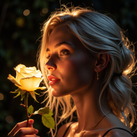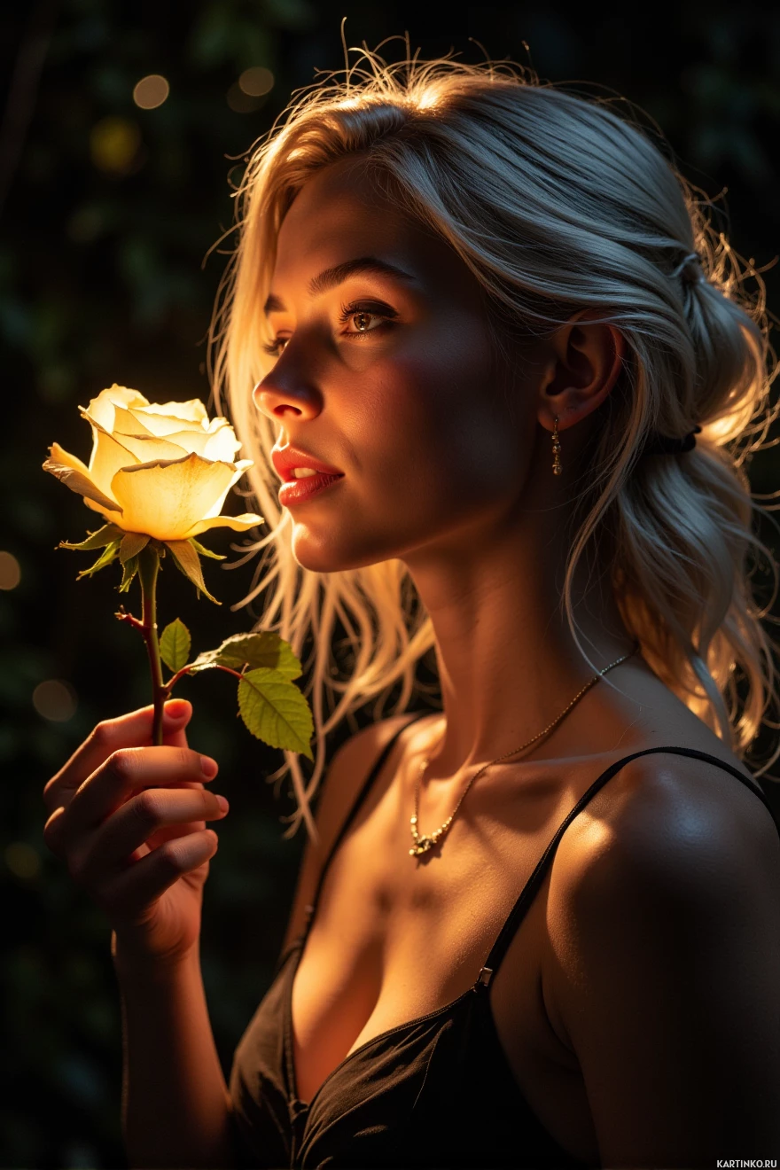 a young woman with blonde hair, holding a yellow rose in her hand. She is wearing