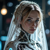 The image depicts a woman with blonde hair, adorned in a wedding veil and a robotic exoskeleton, evoking a sense of