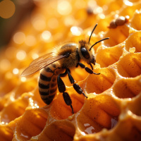 yellow liquid. The cells are arranged in a repeating pattern, with some of them appearing to be empty or partially filled. * In the background, there are more bees flying around and sitting on top of the honeycomb. Some of them appear to be busy collecting nectar from the flowers, while others seem to be resting or grooming themselves. Overall, the image suggests that the bee is collecting nectar from the flowers and bringing it back to its hive to store in the honeycomb. The presence of other bees in the background adds context to the scene, implying that this is a busy and active hive.
