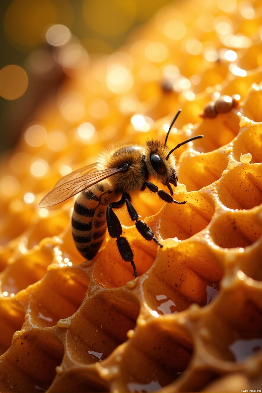 striped body, with its wings folded against its back. Its legs are long and thin, and it appears to be standing on one leg while holding onto the honeycomb with the other. * The honeycomb is made up of many hexagonal cells that are filled with a golden-
