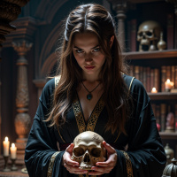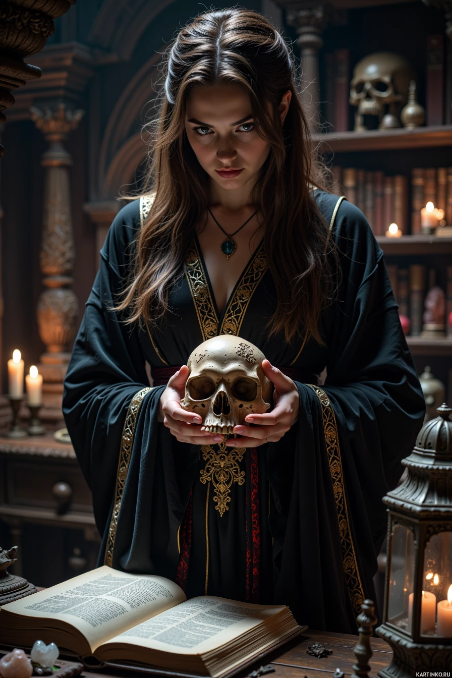 brown hair and is dressed in a dark-colored robe with gold trim, adorned with a necklace featuring a blue stone pendant. Her eyes are cast downward as she examines the skull closely. In her left hand, she grasps the skull by its jawbone, while her right hand rests on top of it. The bookshelf behind her is filled with books and other objects, including what appears to be a candle or lantern on the bottom shelf. A few crystals or gemstones are scattered across the table in front of her. The overall atmosphere of the image suggests that the woman is engaged in some sort of ritualistic or spiritual activity, possibly involving divination or necromancy. The