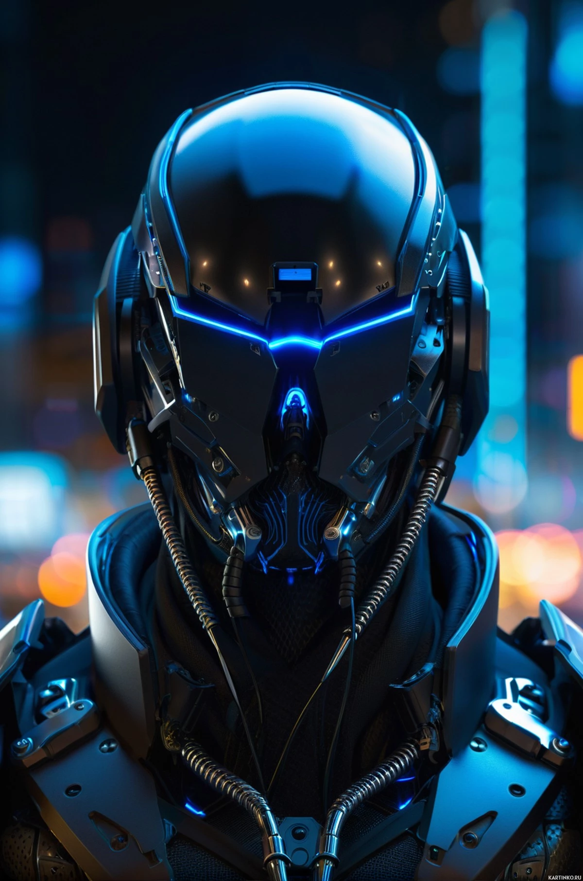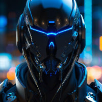 advanced technology elements integrated into the design. The helmet has a visor that is tinted blue, giving it a cybernetic or robotic appearance. The character is set against