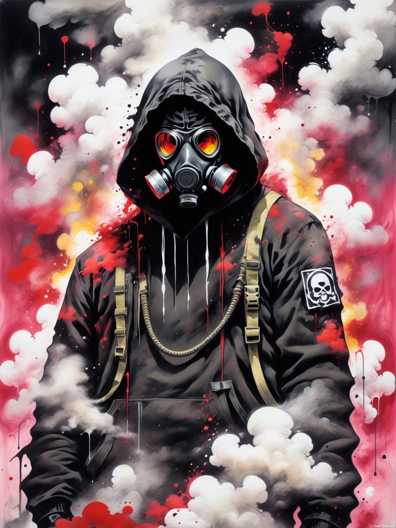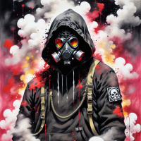 unknown substances. There are explosive or combustible elements surrounding the figure, indicated by the red and orange hues, which may be interpreted as flames or smoke. The overall aesthetic of the artwork is dark and dramatic, with a focus on contrasting colors to emphasize the intensity and hazardous nature portrayed by the character's attire and surroundings.