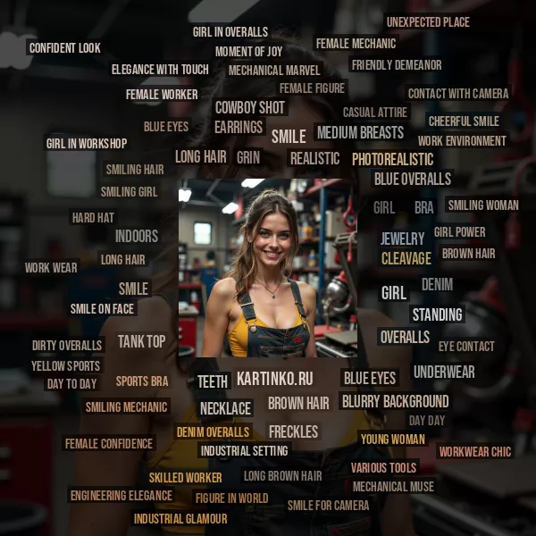 various tools and equipment visible, including a red toolbox, a blue cabinet, and some shelves with unknown items on them. The overall atmosphere suggests that the woman is in a workshop or garage of some kind, possibly working on a project or repairing something.