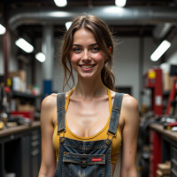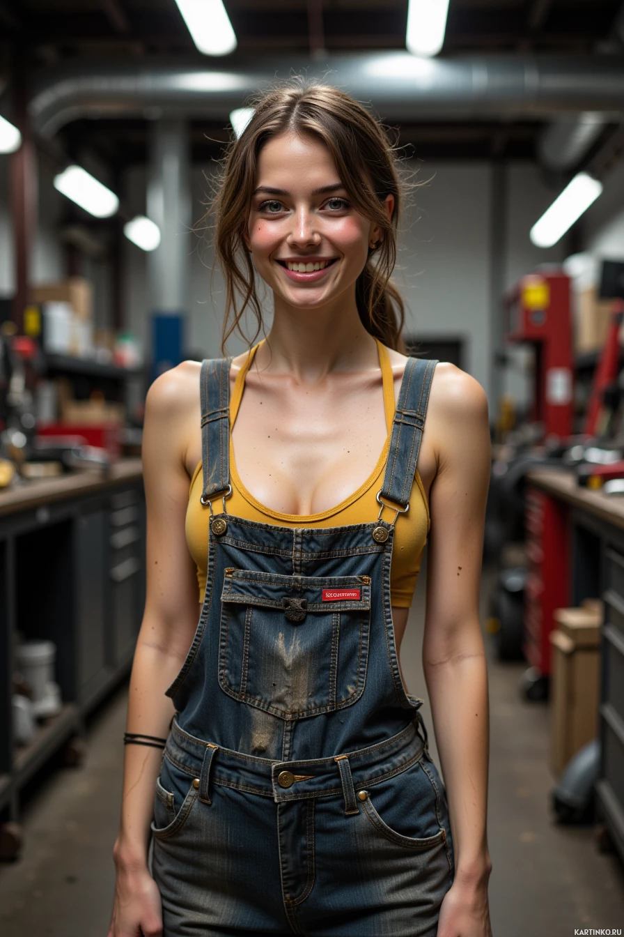 brown hair tied back in a ponytail and is wearing a yellow tank top under denim overalls, which are slightly dirty, suggesting she may have been working on a project. In the background, there are various tools and equipment scattered about, including a red machine with