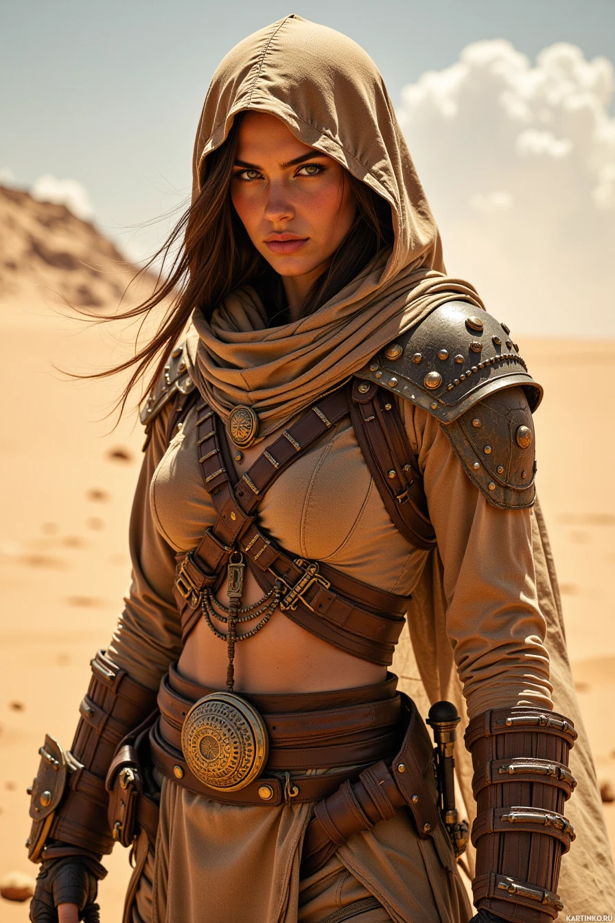 a high neckline. + A wide belt cinches at her waist, adorned with a large, ornate buckle. * Her feet are clad in sturdy ankle-high boots with low heels. + The boots appear to be made of leather and feature intricate stitching along the sides. + She wears a pair of gloves on her hands, which are also made of leather and have a rugged texture. The overall design of her outfit suggests that she is preparing for an extended journey through the desert.