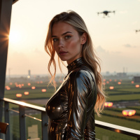 blonde hair, wearing a shiny black leather catsuit that accentuates her curves. She is standing on an outdoor balcony or patio, gazing out over the cityscape below. The outfit is sleek and modern, and her hairstyle adds to her glamorous appearance. In the background, there are several drones flying in formation above the city, adding