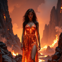 dark hair and is wearing a dress that appears to be made of lava or molten rock, with cracks and fissures visible throughout its surface. The dress is sleeveless and has