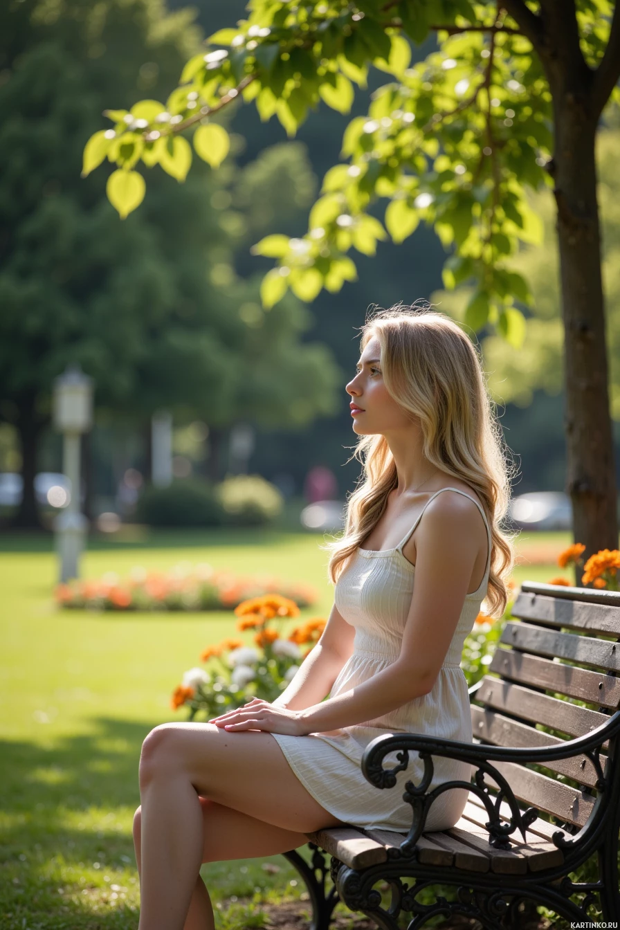 a white dress that exposes her legs and has her hands resting on her lap. The background of the image is blurred, but it appears to be a park or garden setting with greenery and flowers visible. The overall atmosphere of the image suggests a warm and sunny day, possibly during the summer months when people often visit parks and gardens to enjoy the outdoors. The woman's relaxed posture and