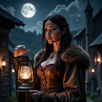 an ethereal glow over the scene. The woman's expression is serious and contemplative as she gazes up at the moon. Her hand holds a lantern close to her body, which casts a warm light on her face. The overall atmosphere of the image is one of mystery and intrigue, with the woman's enigmatic expression and the eerie lighting creating a sense of tension.