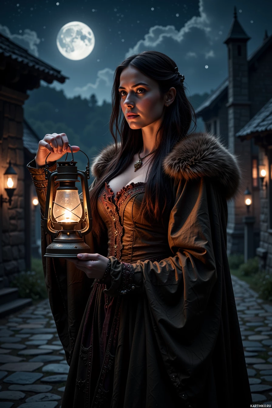 a cobblestone street at night, holding a lantern. The woman is dressed in an old-fashioned brown dress with