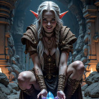 joyful expression and the abundance of precious stones creating a sense of magic and mystery. Overall, the image conveys a sense of fantasy and adventure, inviting the viewer to explore the world of this