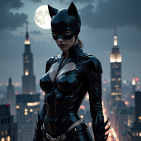 The image depicts a woman dressed as Catwoman, standing on a rooftop overlooking a cityscape at night. She is wearing a black leather catsuit with a mask that covers her eyes and has