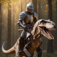 The image portrays a medieval warrior riding on the back of a T-Rex in