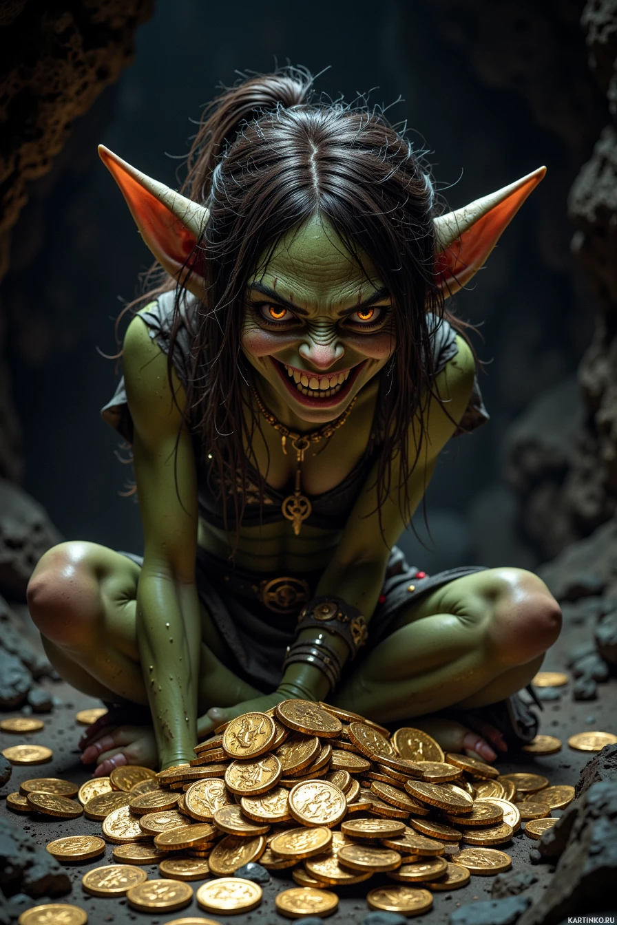 gold coins that glint in the faint light. The overall atmosphere of the image is one of darkness and foreboding, with the goblin's menacing grin and glowing eyes creating an ominous presence. The use of muted colors and dim lighting adds to the sense of unease, making the image feel like it could be from a fantasy novel or video game.