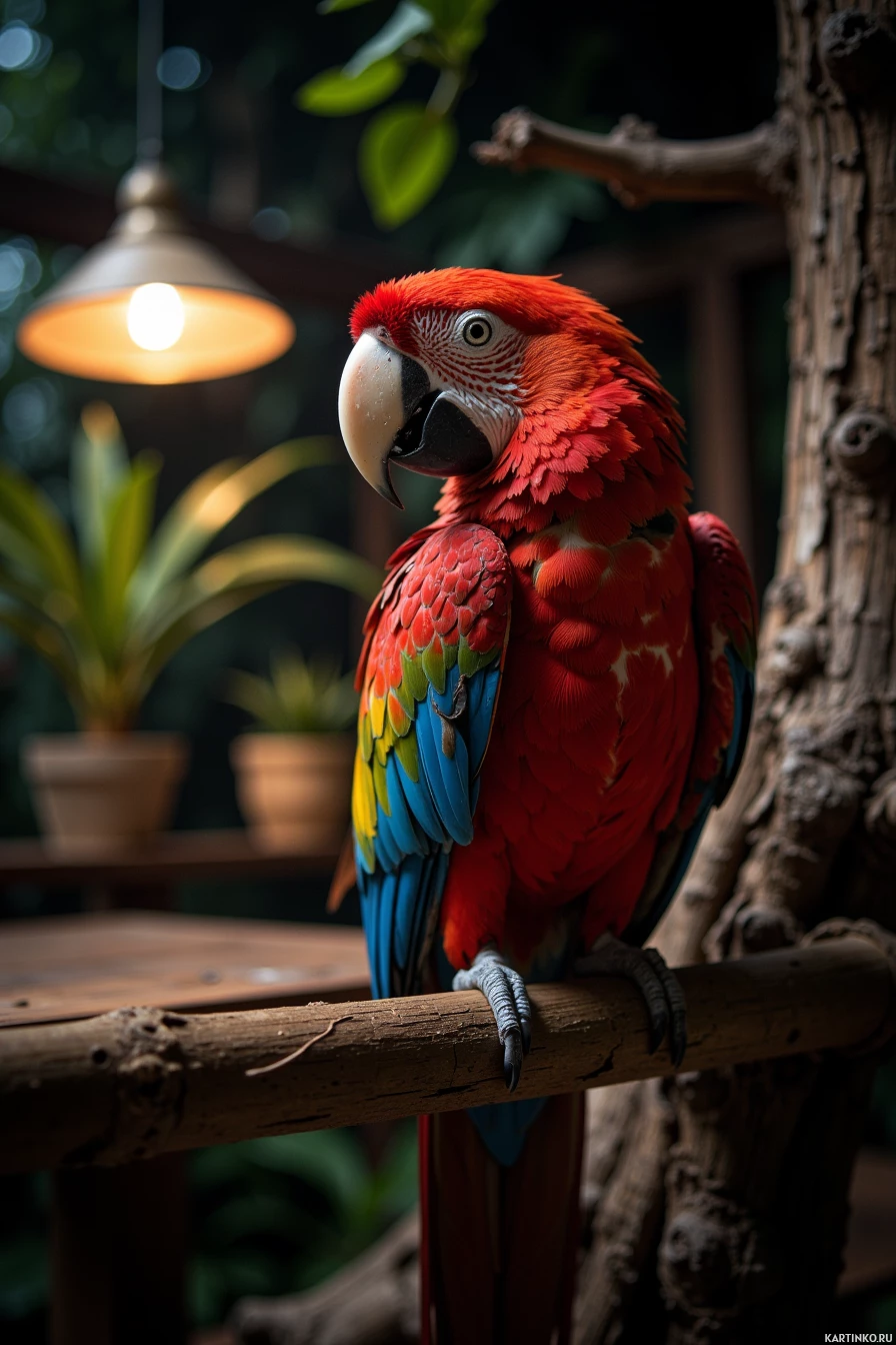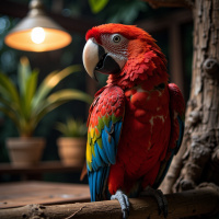 tail feathers are long and slender, extending behind it. Behind the parrot, an aviary is visible. The background features