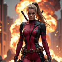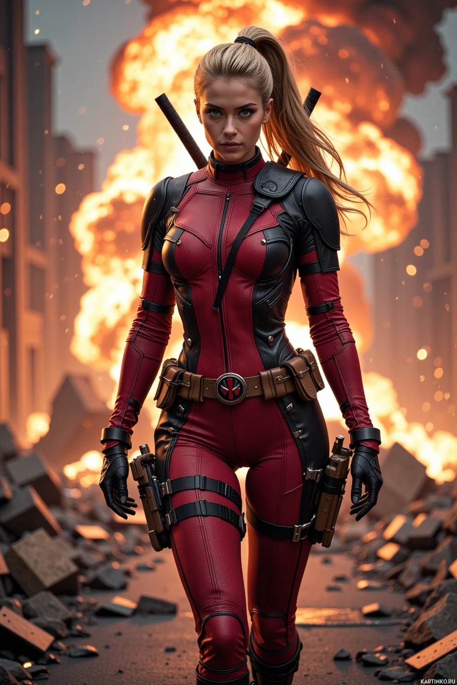 The image depicts a woman dressed as Deadpool, standing in front of an explosion. She has long