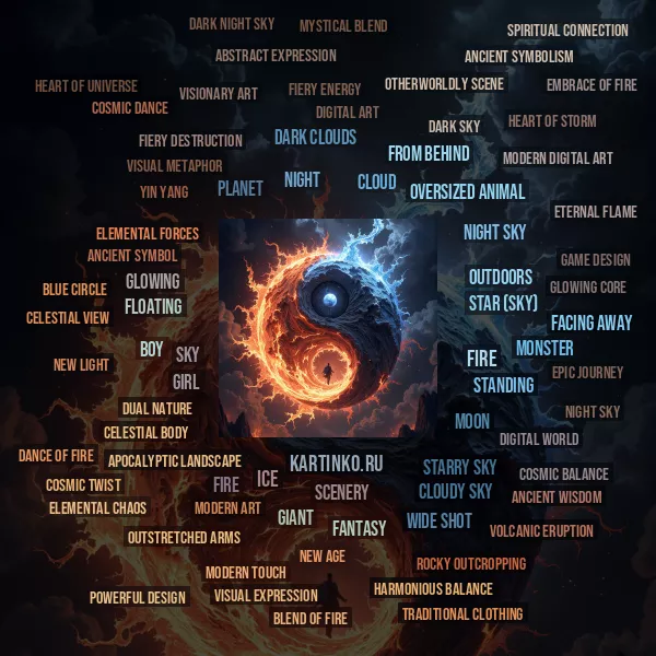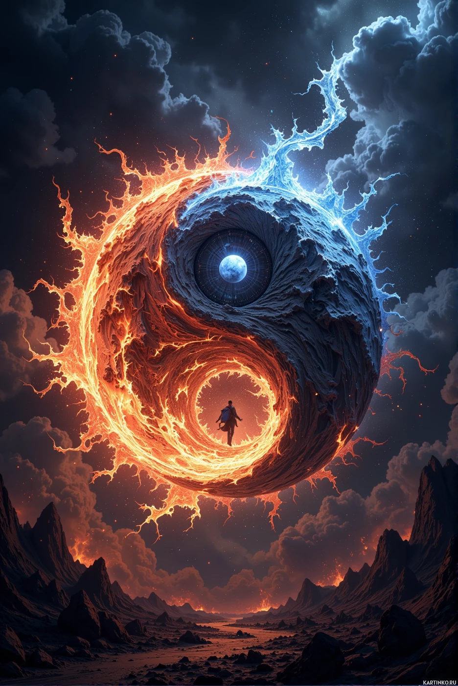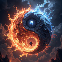 a harmonious balance between opposing forces, represented by fire and ice. The yin-yang symbol is divided into two halves, with fire on one side and ice on the other. In the center of the yin-yang symbol is an eye that represents the universe or cosmos. The eye is surrounded by