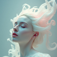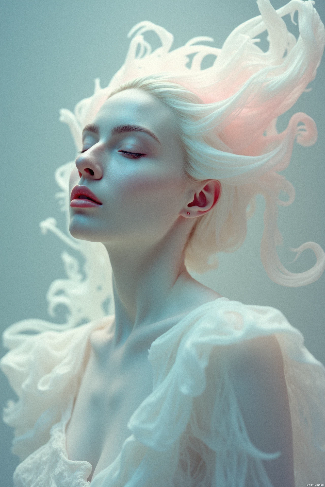 a young woman with white hair, her eyes closed in a serene expression. Her skin is pale, and she wears a flowing