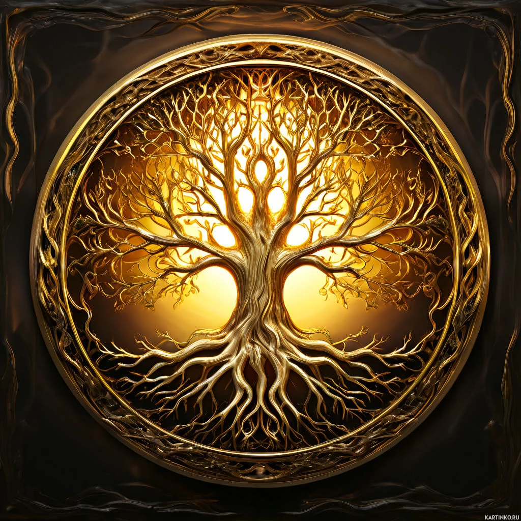 a glowing orb that seems to be radiating light or energy. The tree's roots are visible and intertwined with other elements in the background, suggesting a complex and interconnected web. The artwork style leans towards fantasy or mythical themes, with