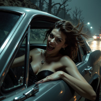 strapless dress that exposes her shoulders and upper chest, adding to the sense of drama and urgency. The car itself appears to be an older model, with