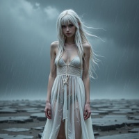 a young woman with long, flowing white hair standing in the rain. She is dressed in
