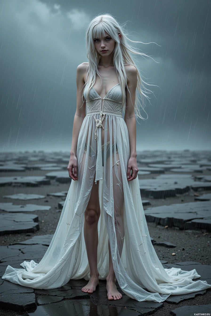 effortless look. Her face is pale and delicate, with high cheekbones and full lips. She has dark eyes and eyebrows, which are slightly arched at the outer corners to give her an exotic appearance. The woman stands barefoot on a wet surface, possibly a stone or concrete floor. The rain pours down around her, creating small puddles that reflect the light. In the background, there is a blurred view of a cityscape or landscape, with buildings and trees visible in the distance. Overall, the image conveys a sense of elegance and refinement, despite being set in a rainy environment. The woman's white dress and flowing hair create a dramatic contrast against the dark backdrop, drawing attention to her features and figure.