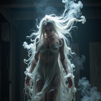 white hair and closed eyes, surrounded by smoke. She is wearing