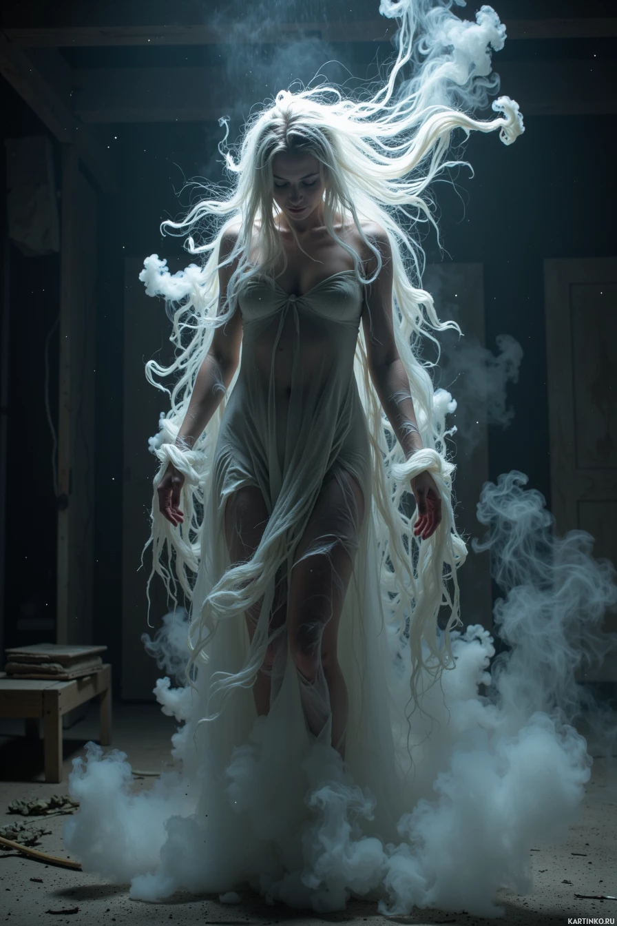 a misty atmosphere that adds to the mystical quality of the scene. The smoke appears to be coming from an unknown source, possibly a nearby fire or incense burner. It swirls around the woman's feet, creating a sense of movement and energy. In the background, there is a darkened room with wooden beams visible on the ceiling. A small table or bench can be seen in the corner, with a few objects scattered about. The overall atmosphere of the image is one of serenity and contemplation, inviting the viewer to step into the peaceful world depicted within.