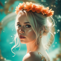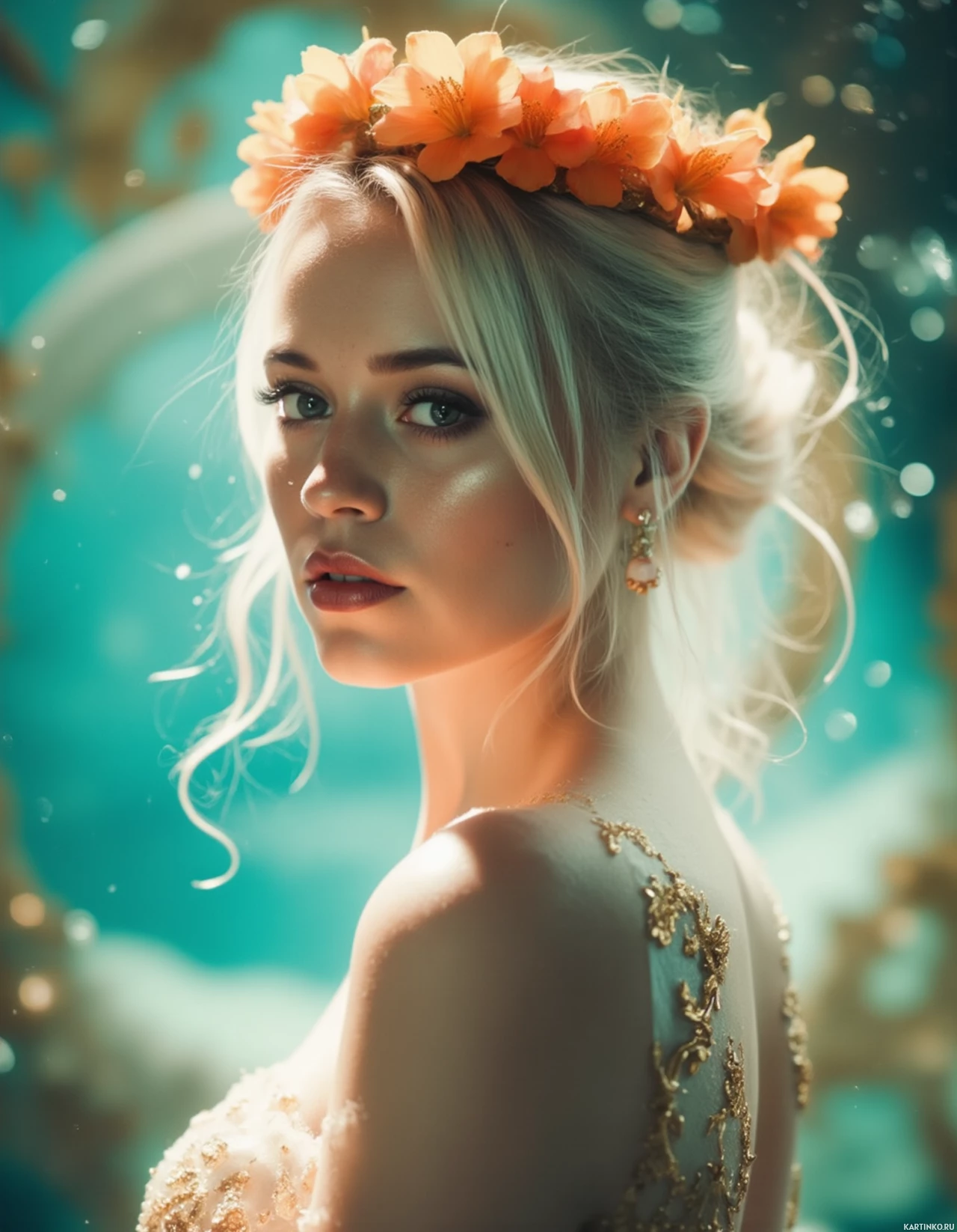 a young woman with blonde hair, adorned with an orange flower crown and dressed in a white dress embellished with gold embroidery. The background of the image is blurred, but it appears to be a teal-colored wall or backdrop. In the foreground, the woman's face is prominently featured, showcasing her fair skin and piercing