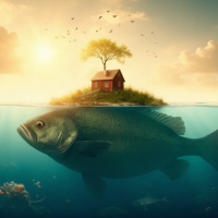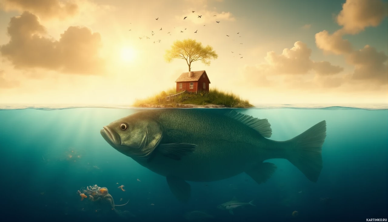 a serene scene of an island in the water, with a small house on it and a large fish swimming beneath the surface. The island is surrounded by