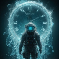 space suit and helmet, and appears to be looking at the clock with a focused expression. There's a sense of melancholy or introspection conveyed by the broken clock and